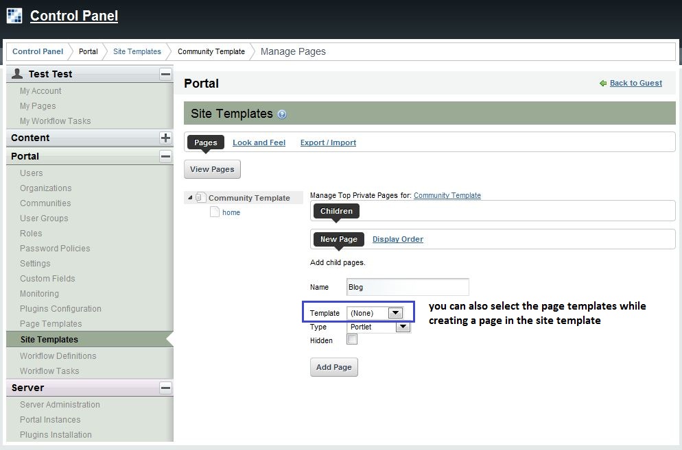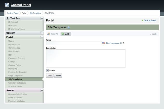 3) Go to Control Panel -> Site template , Click Actions (for the newly created template ) -> Manage Pages to create pages in the newly created template.